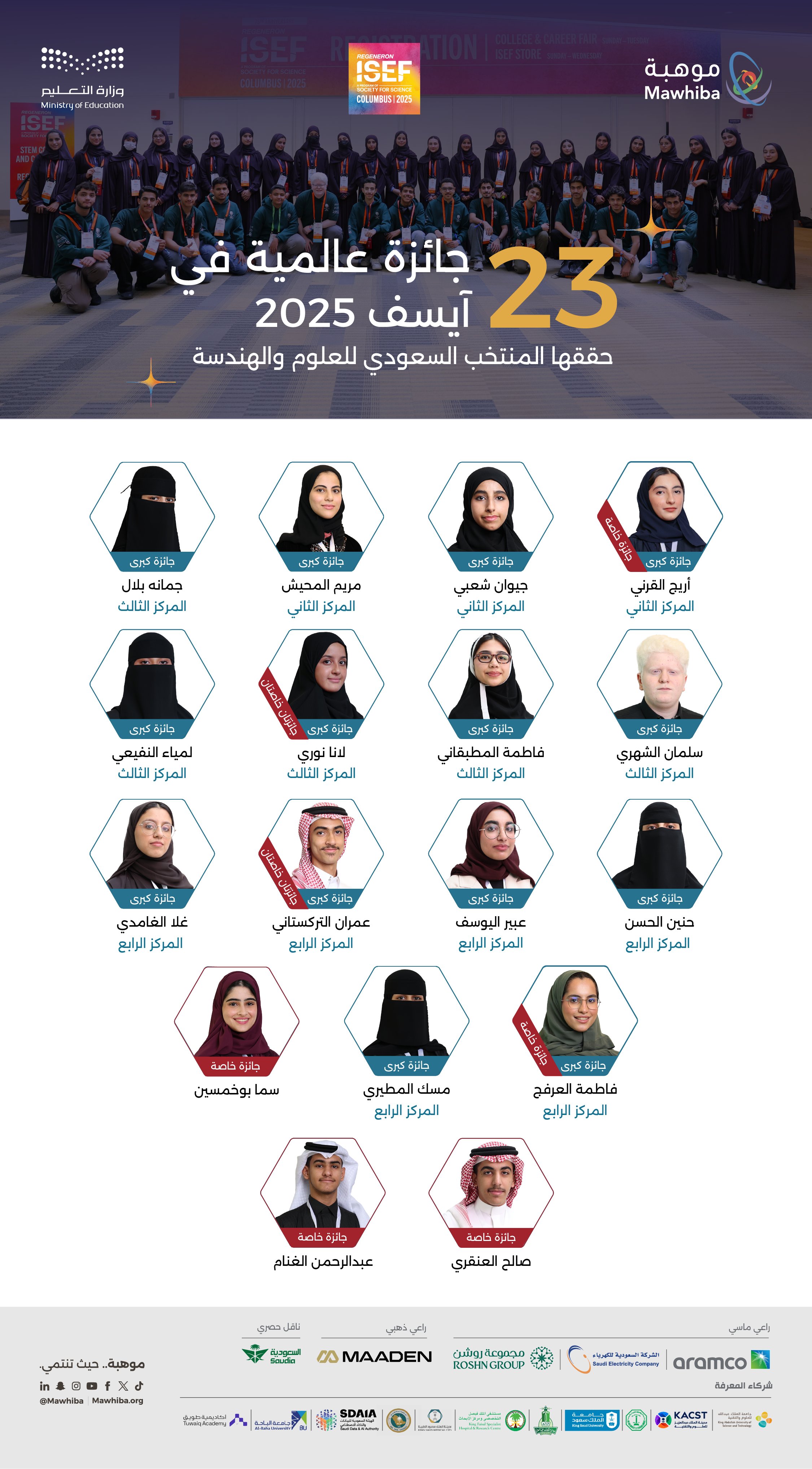 وحقق المركز الثاني من بين 1700 طالب وطالبة كل من: الطالبة مريم المحيش في مجال الطاقة والطالبتان أريج القرني وجيوان شعبي في مجال الهندسة البيئية.
